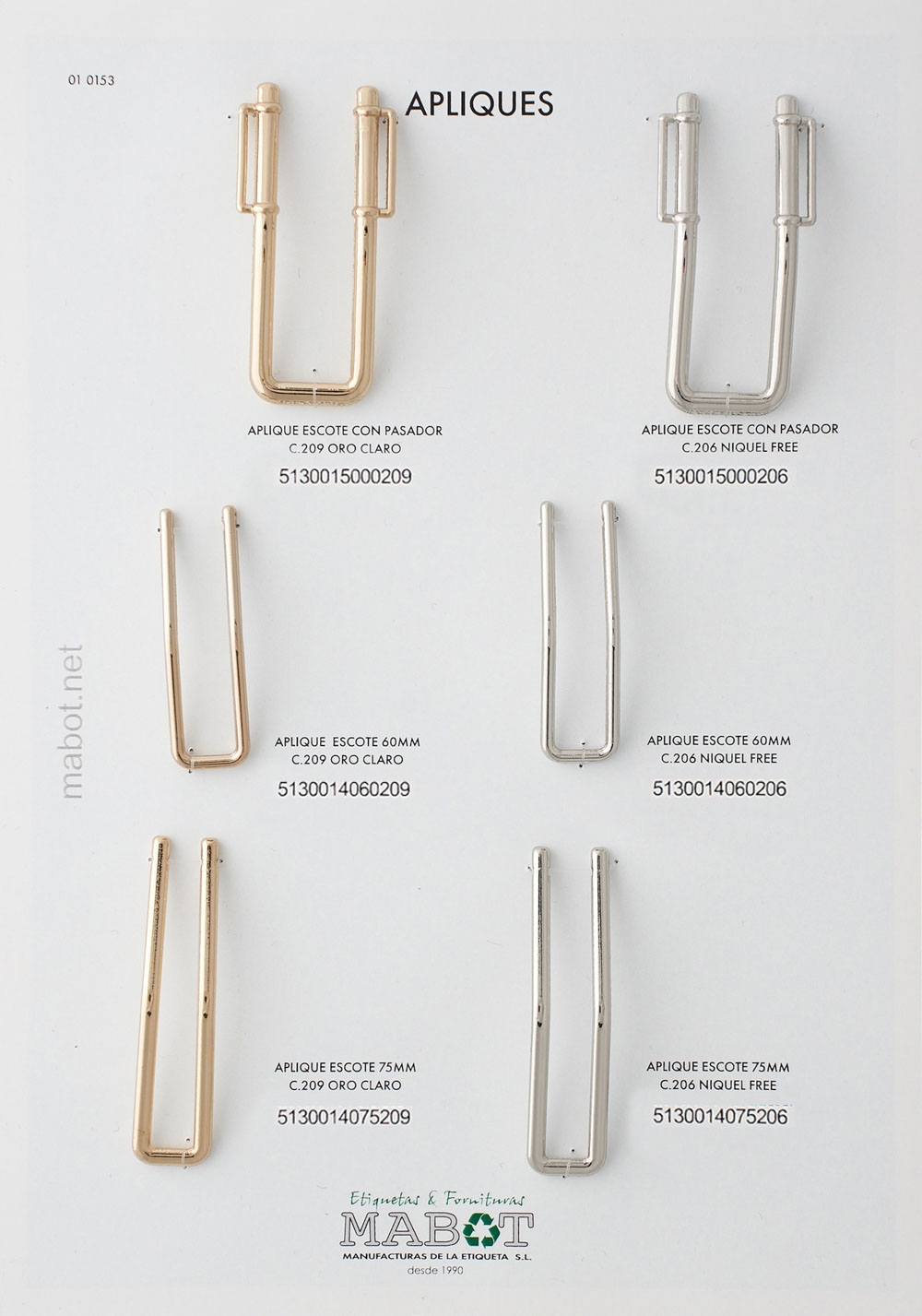 Apliques para escote en diferentes medidas y formas disponible en Niquel Free y Oro claro.