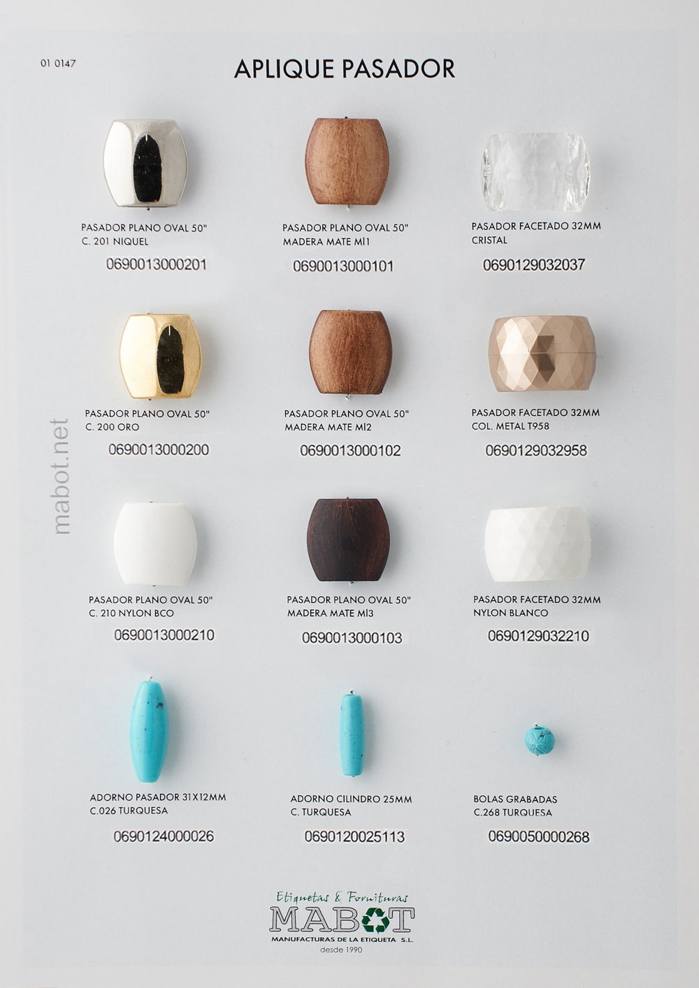 Apliques pasador planos en forma oval en diferentes acabados como oro, niquel, nylon y madera.