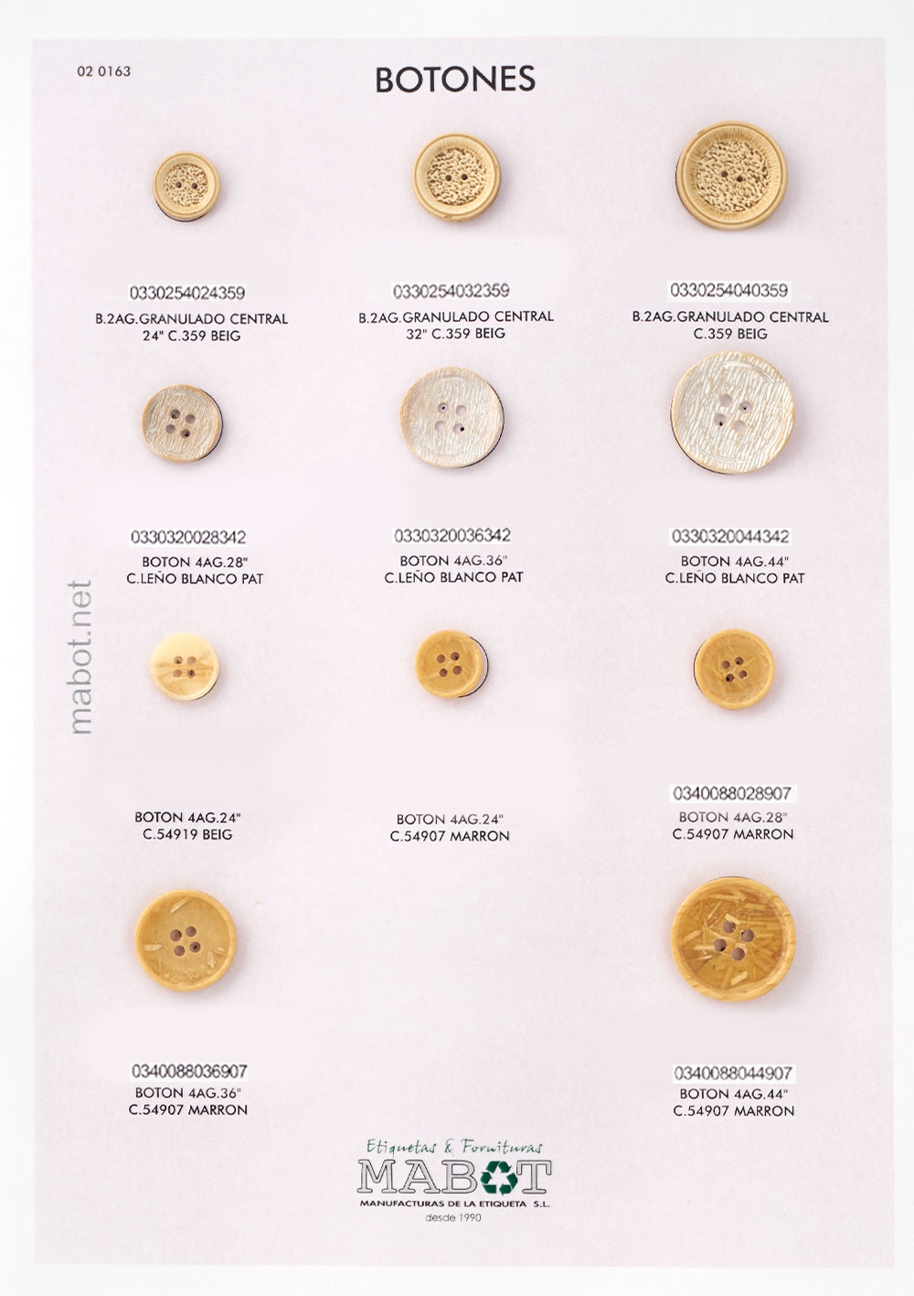 Botón 4 agujeros en leño blanco pat., en medidas: 28", 36", 44".