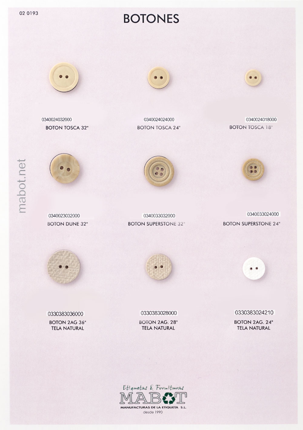 Botón 2 agujeros tela natural, en medidas: 36", 28", 24".