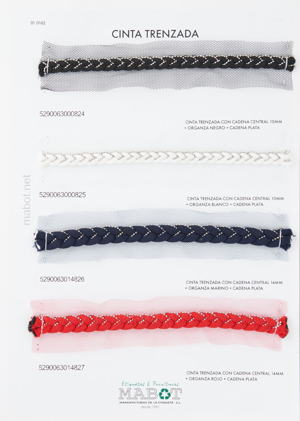 Cinta trenzada con cadena central 10mm + organza blanco + cadena plata.