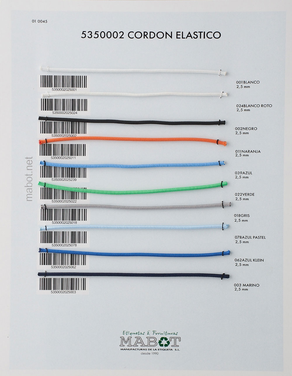 Cordón elástico 2,5mm, colores disponibles: blanco, blanco roto, negro, naranja, azul, verde, gris, azul pastel, azul klein, marino.