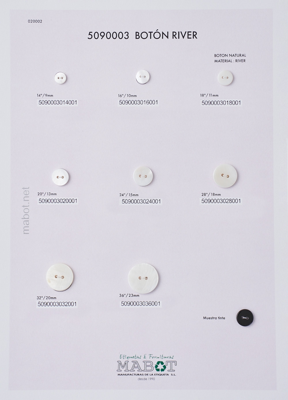 Boton natural river 2 agujeros, con opción de tintar disponible de la linea 14 a la linea 36