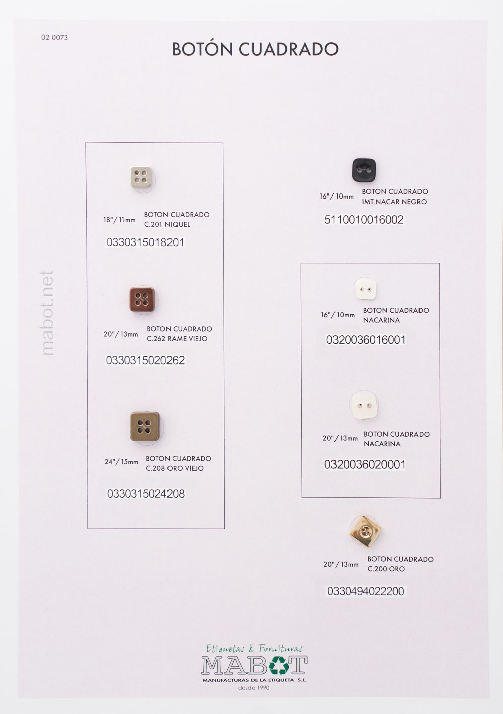 También disponemos de botón cuadrado en diferentes líneas y diferentes acabados (níquel, rame viejo, oro viejo, nacar negro, nacarina, oro).