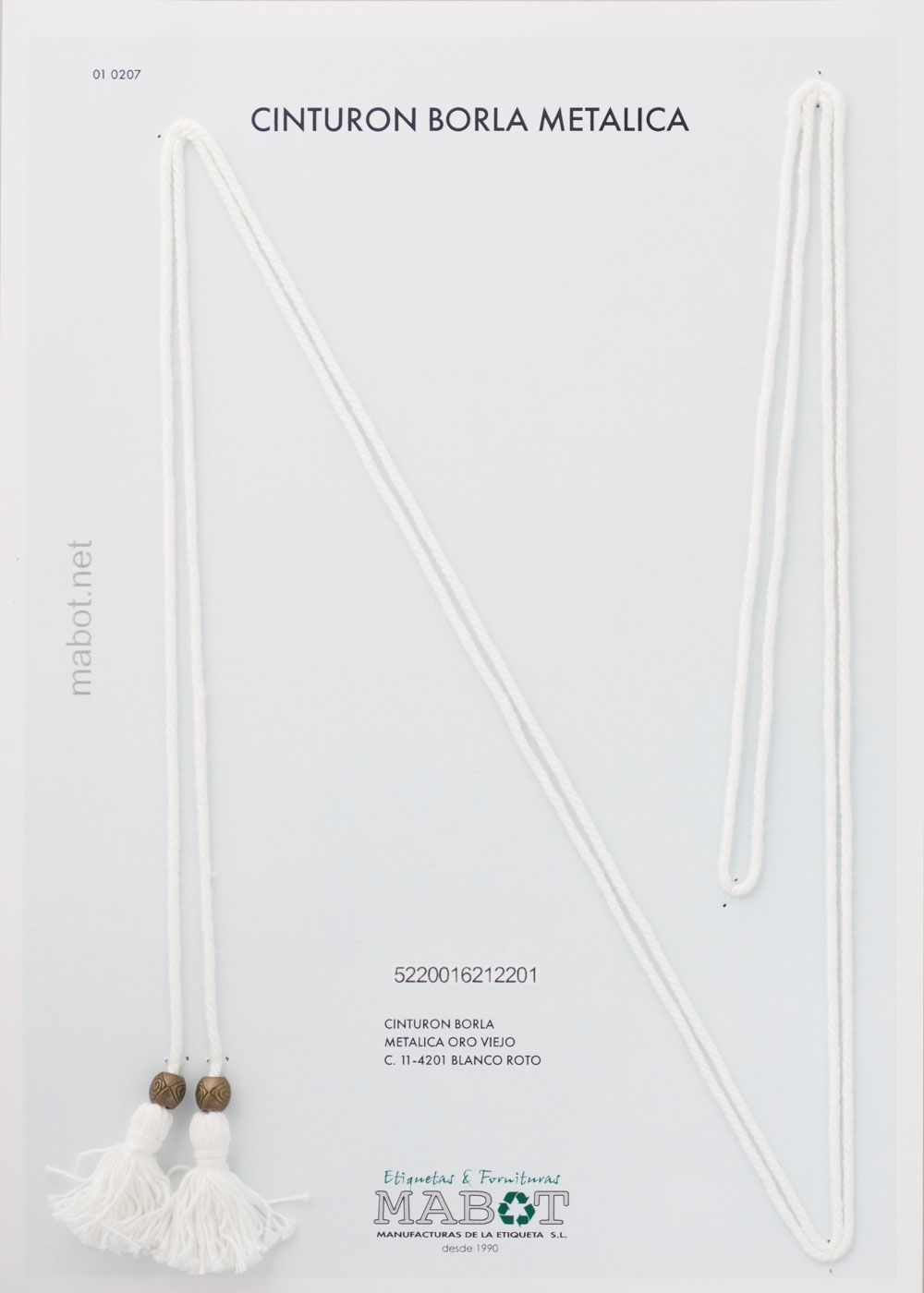 Cinturón borla metálica oro viejo color blanco roto.