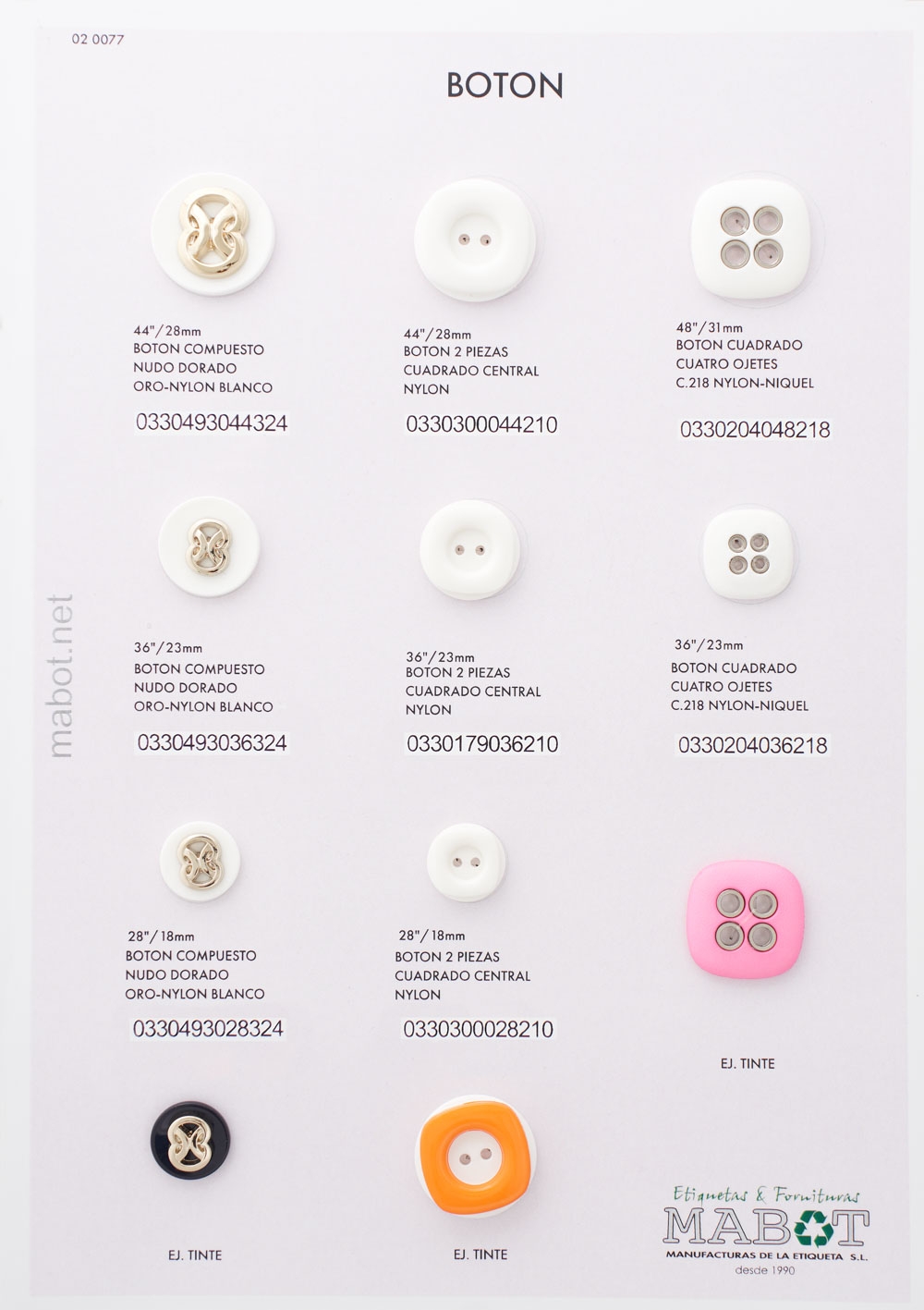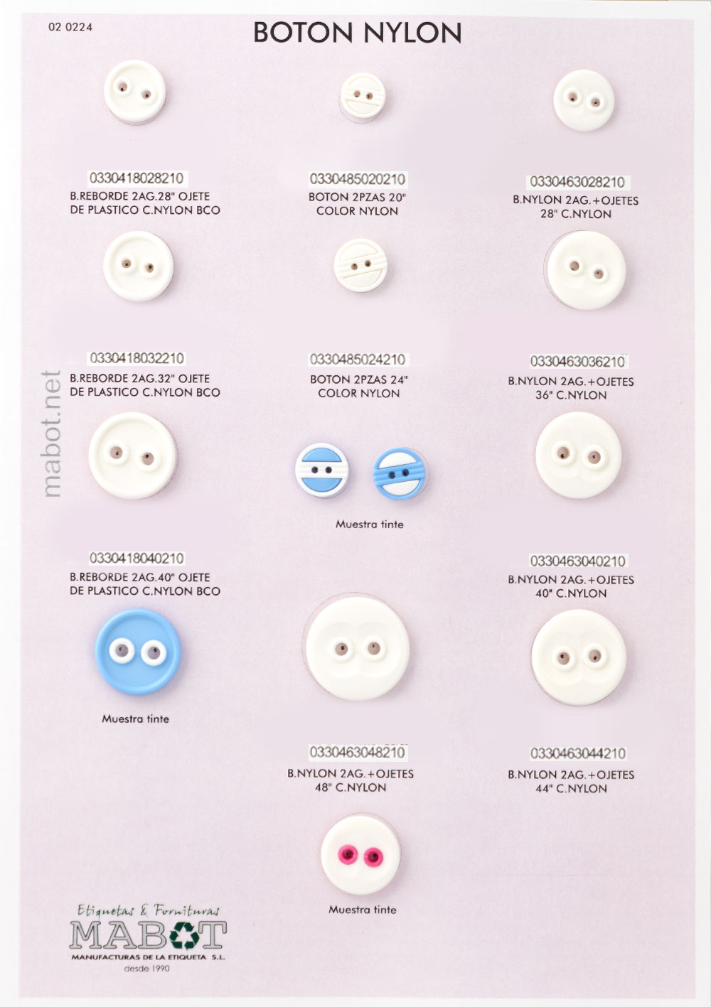 Botón nylon 2 agujeros + ojetes en nylon, en medidas: 28", 36", 40", 44", 48".