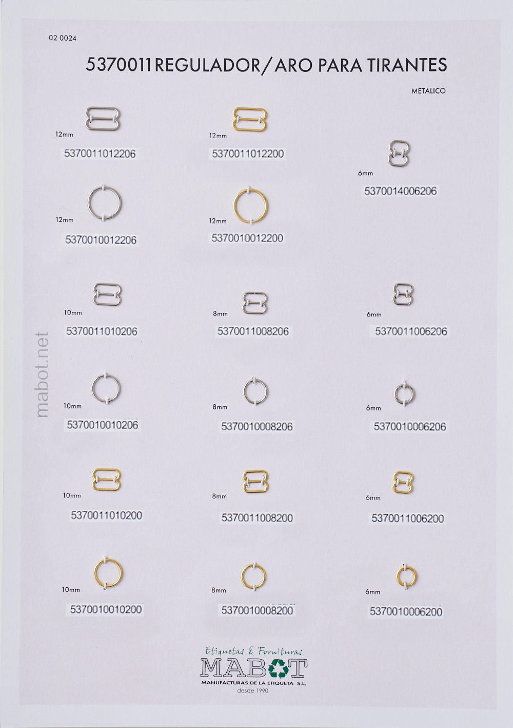 Tenemos variedad de reguladores y aros como método de sujeción para tirantes, para baño y ropa interior en medidas que van de los 6 a los 12mm para adaptarse a cualquier necesidad".
