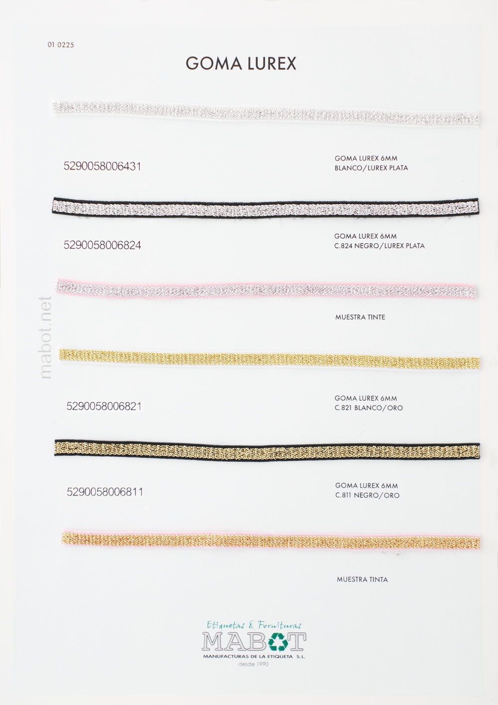 Goma lurex 6mm disponible en los siguientes colores: blanco / lurex plata, negro / lurex plata, blanco / oro, negro / oro.