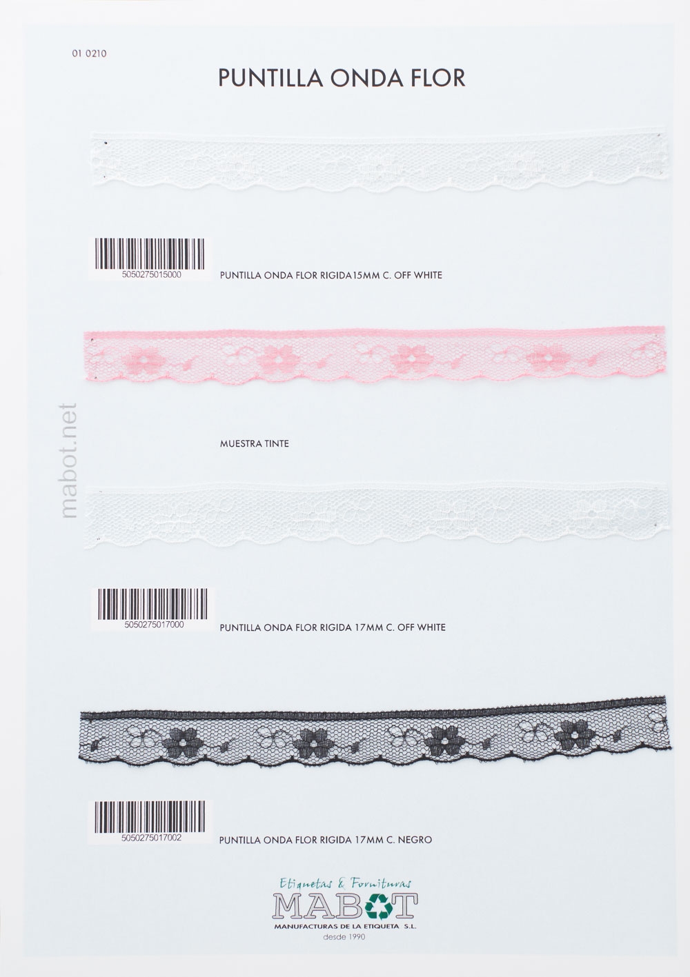 Puntilla onda flor rígida 17mm. Colores disponibles: off white, negro.