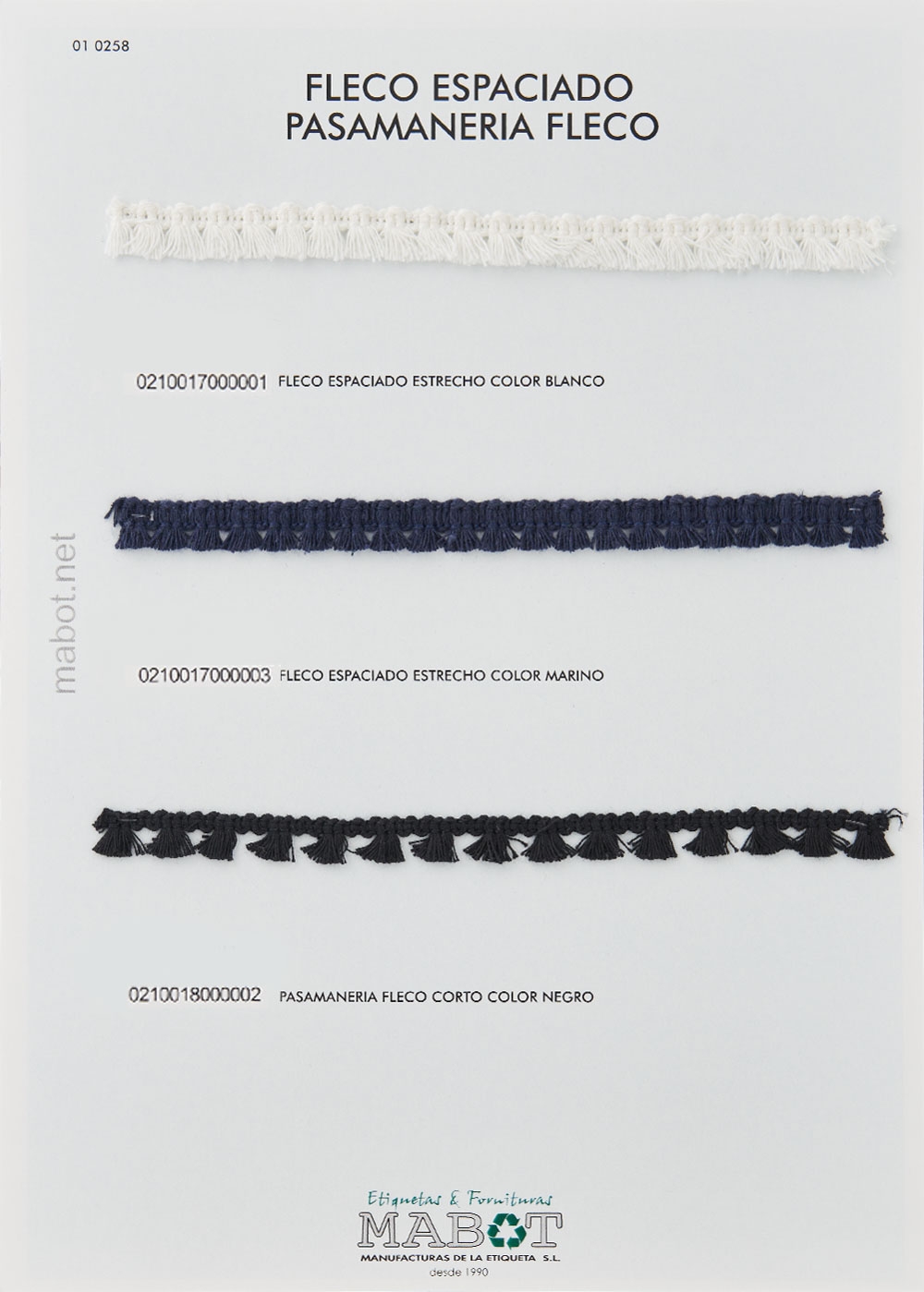 Fleco espaciado estrecho, disponible en: crudo, negro, blanco, marino.