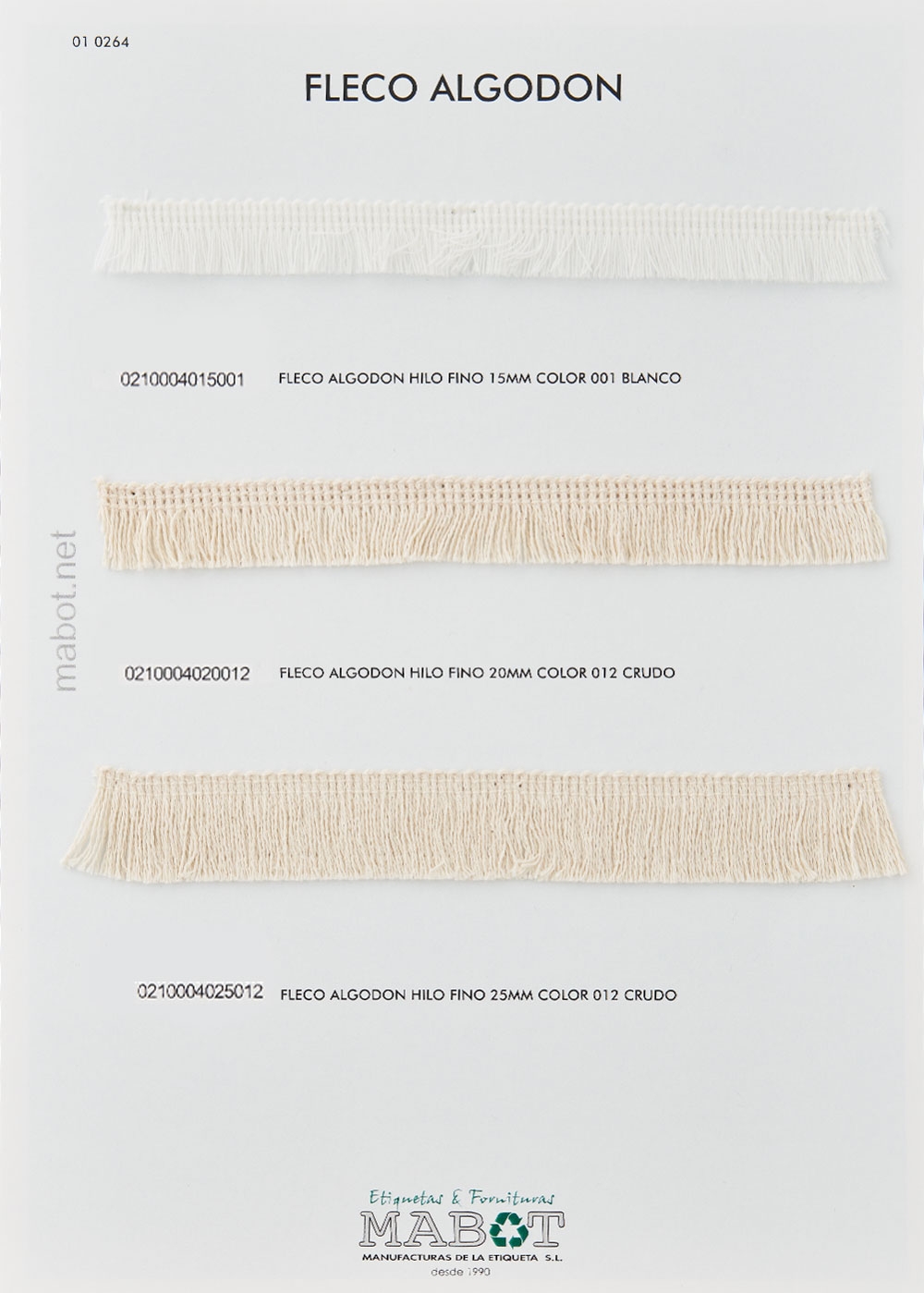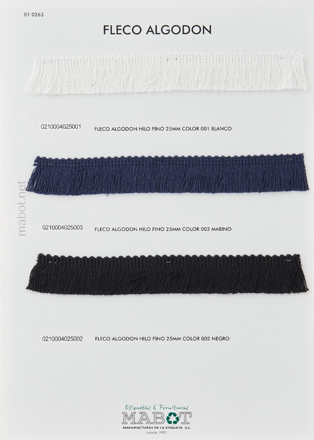 Fleco algodón hilo fino 25mm, disponible en: blanco, marino, negro, crudo.