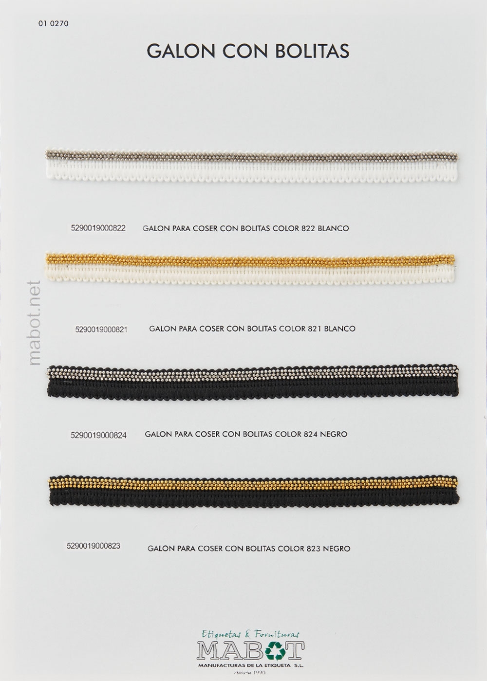 Galón para coser con bolitas, disponible en: blanco-arena, blanco-oro, negro-arena, negro-oro.