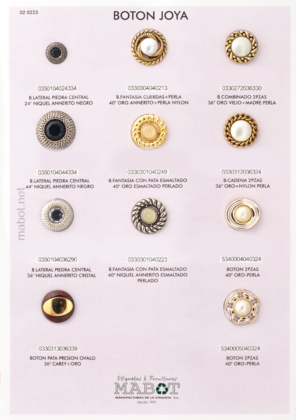 Botón fantasía con pata esmaltado 40", disponible en: oro esmaltado perlado; niquel annerito esmaltado perlado.
