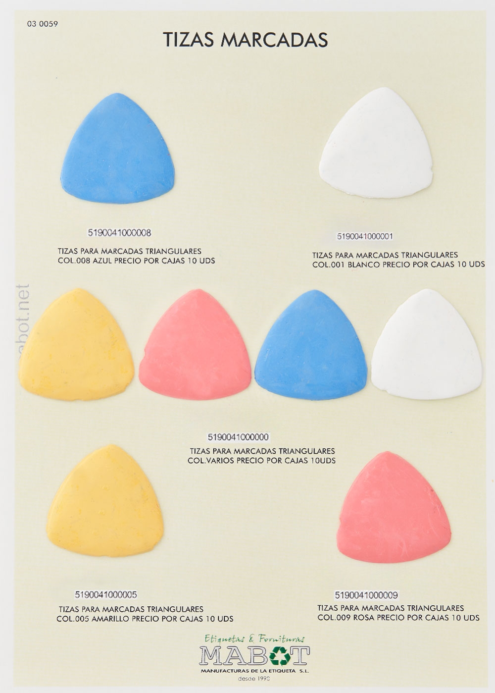 Tizas para marcar triangulares, disponible en: blanco, azul, amarillo, rosa. Se venden en cajas de 10 unidades.