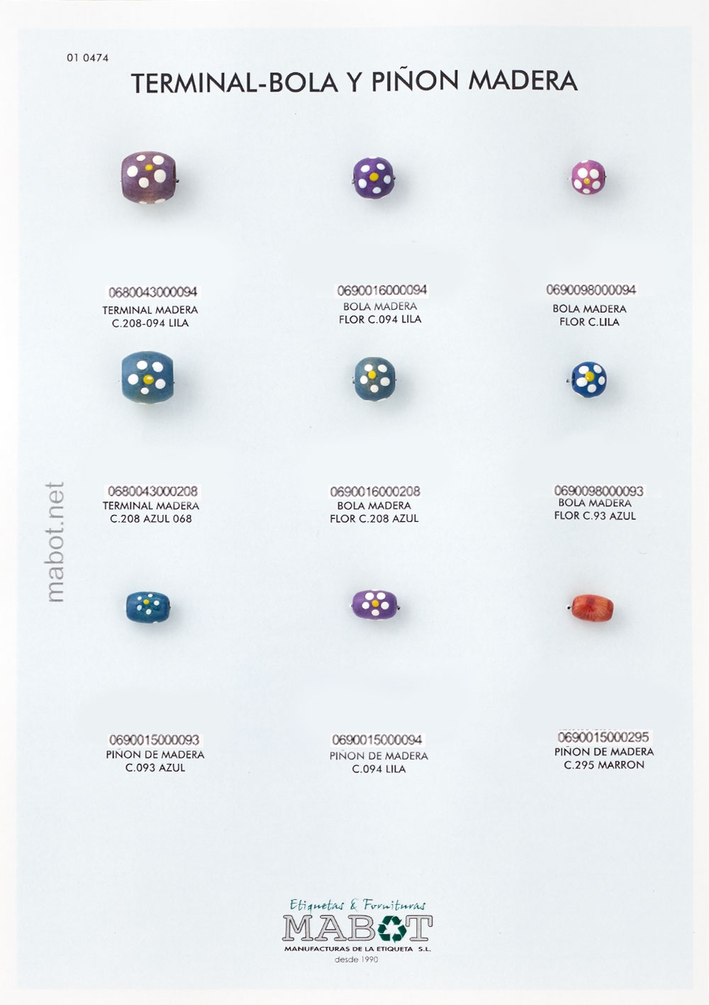 Bola madera flor, disponible en: c.094 lila, c.208 azul, lila, c.93 azul.