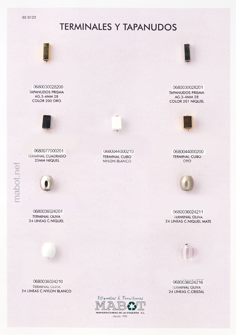 Terminal oliva 24 lineas, disponible en: niquel, niquel matem nylon blanco, cristal.