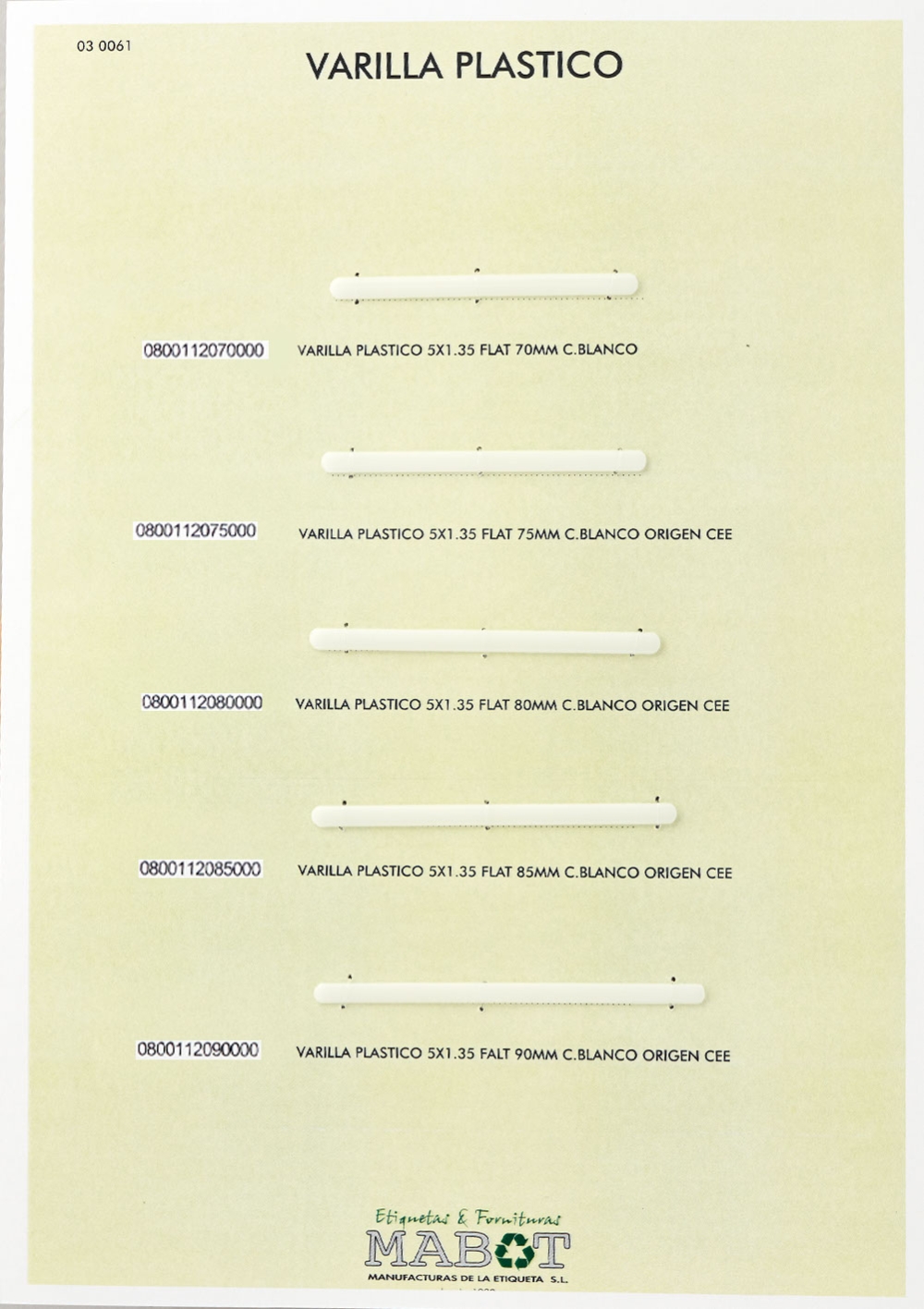 Varilla plástico 5x1,35 flat 80mm en color blanco origen cee.